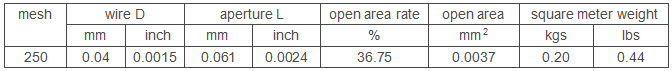 250 mesh plain weave stainless steel wire mesh including 250 wires and openings of 1 inch Using 0.04mm diameter wire, by plain weaving, woven 250 mesh opening for 0.061mm liquid or gas filter.. This wire diameter and mesh with ratio reasonable, therefore weave structure is very strong. After 13 whole weaving process, so that the mesh surface flatness better