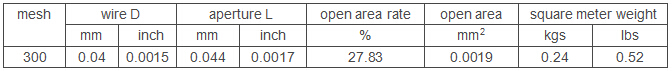 300 mesh plain weave stainless steel wire mesh including 300 wires and openings of 1 inch Using 0.04mm diameter wire, by plain weaving, woven 300 mesh opening for 0.044mm liquid or gas filter.. This wire diameter and mesh with ratio reasonable, therefore weave structure is very strong. After 13 whole weaving process, so that the mesh surface flatness better