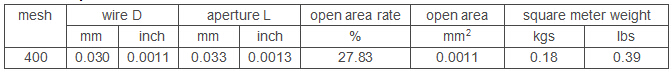 400 mesh twill weave stainless steel wire mesh including 400 wires and openings of 1 inch Using 0.03mm diameter wire, by twill weaving, woven 400 mesh opening for 0.033mm liquid or gas filter . This wire diameter and mesh with ratio reasonable, therefore weave structure is very strong. After 13 whole weaving process, so that the mesh surface flatness better