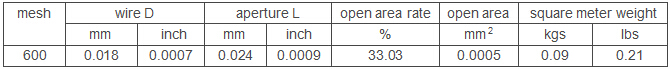 600 mesh twill weave stainless steel wire mesh including 600 wires and openings of 1 inch Using 0.018mm diameter wire, by twill weaving, woven 600 mesh opening for 0.024mm liquid or gas filter. This wire diameter and mesh with ratio reasonable, therefore weave structure is very strong. After 13 whole weaving process, so that the mesh surface flatness better