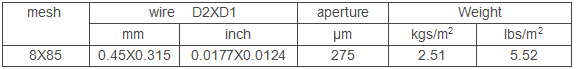 8X85 mesh plain dutch weave stainless steel wire mesh use 0.45X0.315mm diameter wire, by plain dutch weaving, woven 8X85 mesh opening for 275μm solid particles , it can also be used as a liquid, gas filter support material or protective fabrics to use. This wire diameter and mesh with ratio reasonable, therefore weave structure is very strong. After 13 whole weaving process, so that the mesh surface flatness better