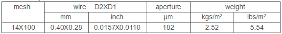 14X100 mesh plain dutch weave stainless steel wire mesh use 0.40X0.28mm diameter wire, by plain dutch weaving, woven 14X100 mesh opening for 182μm solid particles , it can also be used as a liquid, gas filter support material or protective fabrics to use. This wire diameter and mesh with ratio reasonable, therefore weave structure is very strong. After 13 whole weaving process, so that the mesh surface flatness better