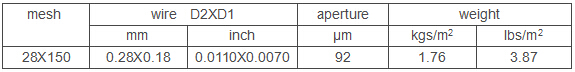 28X150 mesh plain dutch weave stainless steel wire mesh use 0.28X0.18mm diameter wire, by plain dutch weaving, woven 28X150 mesh opening for 92μm solid particles , it can also be used as a liquid, gas filter support material or protective fabrics to use. This wire diameter and mesh with ratio reasonable, therefore weave structure is very strong. After 13 whole weaving process, so that the mesh surface flatness better