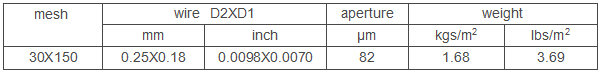 30X150 mesh plain dutch weave stainless steel wire mesh. Using 0.25X0.18mm diameter wire, by plain dutch weaving, woven 30X150 mesh opening for 82μm liquid or gas filter material .This wire diameter and mesh with ratio reasonable, therefore weave structure is very strong. After 13 whole weaving process, so that the mesh surface flatness better.