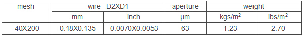 40X200 mesh plain dutch weave stainless steel wire mesh. Using 0.18X0.135mm diameter wire, by plain dutch weaving, woven 40X200 mesh opening for 63μm liquid or gas filter material.This wire diameter and mesh with ratio reasonable, therefore weave structure is very strong. After 13 whole weaving process, so that the mesh surface flatness better.