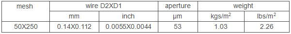 50X250 mesh plain dutch weave stainless steel wire mesh. Using 0.14X0.112mm diameter wire, by plain dutch weaving, woven 50X250 mesh opening for 53μm liquid or gas filter material.This wire diameter and mesh with ratio reasonable, therefore weave structure is very strong. After 13 whole weaving process, so that the mesh surface flatness better.