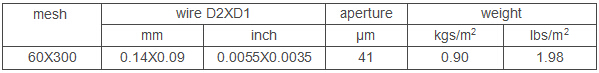 60X300 mesh plain dutch weave stainless steel wire mesh. Using 0.14X0.09mm diameter wire, by plain dutch weaving, woven 60X300 mesh opening for 41μm liquid or gas filter material.This wire diameter and mesh with ratio reasonable, therefore weave structure is very strong. After 13 whole weaving process, so that the mesh surface flatness better.