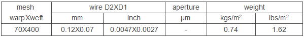 70X400 mesh plain dutch weave stainless steel wire mesh. Using 0.12X0.07mm diameter wire, by plain dutch weaving, woven 70X400 mesh opening, it can be used as liquid or gas filter material.This wire diameter and mesh with ratio reasonable, therefore weave structure is very strong. After 13 whole weaving process, so that the mesh surface flatness better.