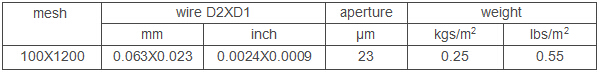 100X1200 mesh plain dutch weave stainless steel wire mesh. Using 0.063X0.023mm diameter wire, by plain dutch weaving, woven 100X1200 mesh opening for 23 μm liquid or gas filter material.This wire diameter and mesh with ratio reasonable, therefore weave structure is very strong. After 13 whole weaving process, so that the mesh surface flatness better.