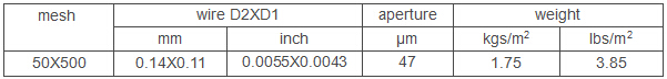 50X500 mesh twill dutch weave stainless steel wire mesh.Using 0.14X0.11mm diameter wire, by twill dutch weaving, woven 50X500 mesh opening for 47μm liquid or gas filter.This wire diameter and mesh with ratio reasonable, therefore weave structure is very strong. After 13 whole weaving process, so that the mesh surface flatness better.