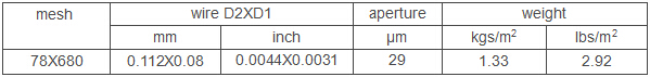 78X680 mesh twill dutch weave stainless steel wire mesh.Using 0.112X0.08mm diameter wire, by twill dutch weaving, woven 78X680 mesh opening for 29μm liquid or gas filter.This wire diameter and mesh with ratio reasonable, therefore weave structure is very strong. After 13 whole weaving process, so that the mesh surface flatness better.