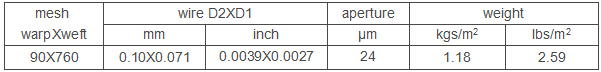90X760 mesh twill dutch weave stainless steel wire mesh.Using 0.10X0.071mm diameter wire, by twill dutch weaving, woven 90X760 mesh opening for 24μm liquid or gas filter.This wire diameter and mesh with ratio reasonable, therefore weave structure is very strong. After 13 whole weaving process, so that the mesh surface flatness better.