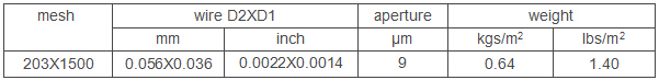 203X1500 mesh twill dutch weave stainless steel wire mesh.Using 0.056X0.036mm diameter wire, by twill dutch weaving, woven 203X1500 mesh opening for 9μm liquid or gas filter.This wire diameter and mesh with ratio reasonable, therefore weave structure is very strong. After 13 whole weaving process, so that the mesh surface flatness better.