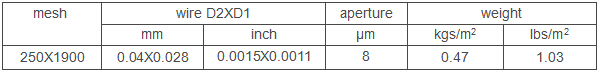 250X1900 mesh twill dutch weave stainless steel wire mesh.Using 0.04X0.028mm diameter wire, by twill dutch weaving, woven 250X1900 mesh opening for 8μm liquid or gas filter.This wire diameter and mesh with ratio reasonable, therefore weave structure is very strong. After 13 whole weaving process, so that the mesh surface flatness better.