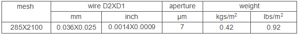 285X2100 mesh twill dutch weave stainless steel wire mesh.Using 0.036X0.025mm diameter wire, by twill dutch weaving, woven 285X2100 mesh opening for 7μm liquid or gas filter.This wire diameter and mesh with ratio reasonable, therefore weave structure is very strong. After 13 whole weaving process, so that the mesh surface flatness better.