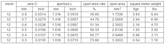 12 mesh plain weave steel wire mesh including 12 wires and openings of 1 inch Using 0.3-0.8mm diameter wire, by plain weaving, woven 12 mesh opening for 1.3-1.8mm solid particles , it can also be used as a liquid, gas coarse filter support material or protective fabrics to use. This wire diameter and mesh with ratio reasonable, therefore weave structure is very strong. After 13 whole weaving process, so that the mesh surface flatness better.