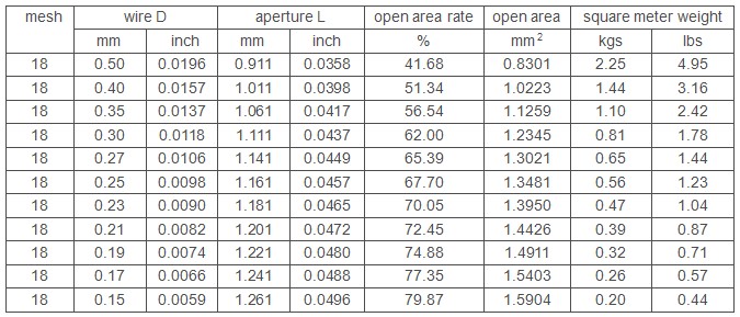 18 mesh plain weave steel wire mesh including 18 wires and openings of 1 inch Using 0.15-0.50mm diameter wire, by plain weaving, woven 18 mesh opening for 0.9-1.2mm solid particles , it can also be used as a liquid, gas coarse filter support material or protective fabrics to use. This wire diameter and mesh with ratio reasonable, therefore weave structure is very strong. After 13 whole weaving process, so that the mesh surface flatness better.