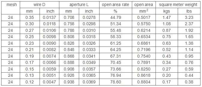 24 mesh plain weave steel wire mesh including 24 wires and openings of 1 inch Using 0.12-0.35mm diameter wire, by plain weaving, woven 24 mesh opening for 0.7-0.9mm solid particles , it can also be used as a liquid, gas coarse filter support material or protective fabrics to use. This wire diameter and mesh with ratio reasonable, therefore weave structure is very strong. After 13 whole weaving process, so that the mesh surface flatness better.