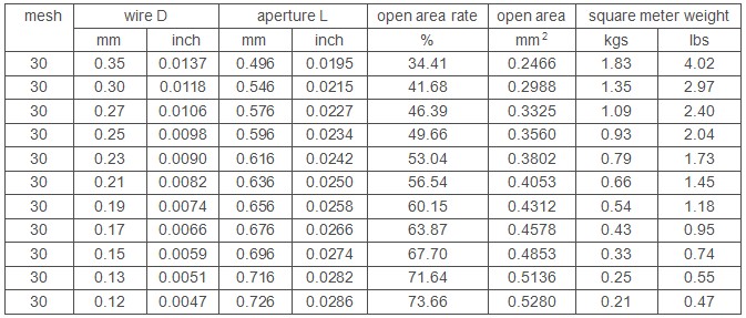 30 mesh plain weave steel wire mesh including 30 wires and openings of 1 inch Using 0.12-0.35mm diameter wire, by plain weaving, woven 30 mesh opening for 0.4-0.7mm solid particles , it can also be used as a liquid, gas filter support material or protective fabrics to use. This wire diameter and mesh with ratio reasonable, therefore weave structure is very strong. After 13 whole weaving process, so that the mesh surface flatness better.