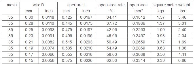 35 mesh plain weave steel wire mesh including 35 wires and openings of 1 inch Using 0.15-0.30mm diameter wire, by plain weaving, woven 35 mesh opening for 0.4-0.5mm solid particles , it can also be used as a liquid, gas filter support material or protective fabrics to use. This wire diameter and mesh with ratio reasonable, therefore weave structure is very strong. After 13 whole weaving process, so that the mesh surface flatness better.