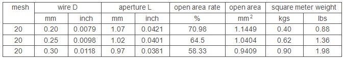 20 mesh steel wire mesh including 20 wires and openings of 1 inch Using 0.20-0.30mm diameter wire, by plain weaving, woven 20 mesh opening for 0.97-1.07mm solid particles , it can also be used as a liquid, gas coarse filter support material or protective fabrics to use. This wire diameter and mesh with ratio reasonable, therefore weave structure is very strong. After 13 whole weaving process, so that the mesh surface flatness better.