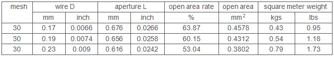 30 mesh steel wire mesh including 30 wires and openings of 1 inch Using 0.17-0.23mm diameter wire, by plain weaving, woven 30 mesh opening for 0.61-0.67mm solid particles , it can also be used as a liquid, gas filter support material or protective fabrics to use. This wire diameter and mesh with ratio reasonable, therefore weave structure is very strong. After 13 whole weaving process, so that the mesh surface flatness better.