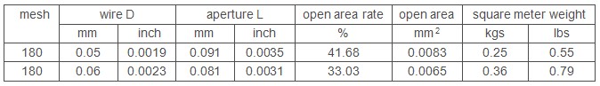180 mesh plain weave brass wire mesh including 180 wires and openings of 1 inch Using 0.05-0.06mm diameter wire, by plain weaving, woven 180 mesh opening for 0.08-0.09mm solid particles , it can also be used as a liquid, gas filter support material or protective fabrics to use. This wire diameter and mesh with ratio reasonable, therefore weave structure is very strong. After 13 whole weaving process, so that the mesh surface flatness better.