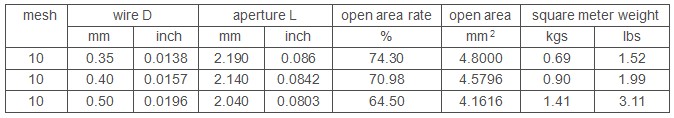 10 mesh plain weave red copper wire mesh including 10 wires and openings of 1 inch Using 0.35-0.50mm diameter wire, by plain weaving, woven 10 mesh opening for 2.0-2.1mm solid particles , it can also be used as a liquid, gas coarse filter support material or protective fabrics to use. This wire diameter and mesh with ratio reasonable, therefore weave structure is very strong. After 13 whole weaving process, so that the mesh surface flatness better.
