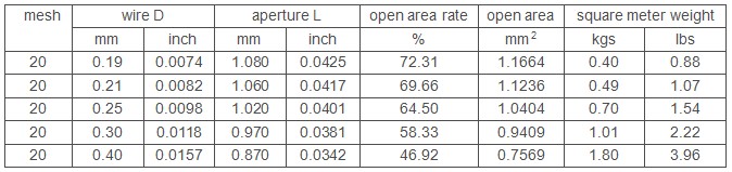 20 mesh plain weave red copper wire mesh including 20 wires and openings of 1 inch Using 0.19-0.40mm diameter wire, by plain weaving, woven 20 mesh opening for 0.8-1.0mm solid particles , it can also be used as a liquid, gas coarse filter support material or protective fabrics to use. This wire diameter and mesh with ratio reasonable, therefore weave structure is very strong. After 13 whole weaving process, so that the mesh surface flatness better.
