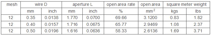 12 mesh plain weave phosphor bronze wire mesh including 12 wires and openings of 1 inch Using 0.35-0.50mm diameter wire, by plain weaving, woven 12 mesh opening for 1.6-1.7mm solid particles , it can also be used as a liquid, gas coarse filter support material or protective fabrics to use. This wire diameter and mesh with ratio reasonable, therefore weave structure is very strong. After 13 whole weaving process, so that the mesh surface flatness better.