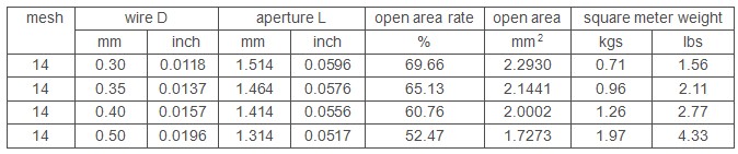 14 mesh plain weave phosphor bronze wire mesh including 14 wires and openings of 1 inch Using 0.30-0.50mm diameter wire, by plain weaving, woven 14 mesh opening for 1.3-1.5mm solid particles , it can also be used as a liquid, gas coarse filter support material or protective fabrics to use. This wire diameter and mesh with ratio reasonable, therefore weave structure is very strong. After 13 whole weaving process, so that the mesh surface flatness better.
