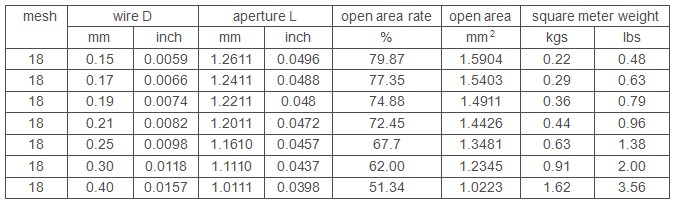 18 mesh plain weave phosphor bronze wire mesh including 18 wires and openings of 1 inch Using 0.15-0.40mm diameter wire, by plain weaving, woven 18 mesh opening for 1.0-1.2mm solid particles , it can also be used as a liquid, gas coarse filter support material or protective fabrics to use. This wire diameter and mesh with ratio reasonable, therefore weave structure is very strong. After 13 whole weaving process, so that the mesh surface flatness better.