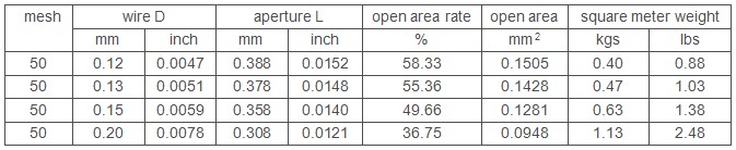 50 mesh plain weave phosphor bronze wire mesh including 50 wires and openings of 1 inch Using 0.12-0.20mm diameter wire, by plain weaving, woven 50 mesh opening for 0.30-0.38mm solid particles , it can also be used as a liquid, gas filter support material or protective fabrics to use. This wire diameter and mesh with ratio reasonable, therefore weave structure is very strong. After 13 whole weaving process, so that the mesh surface flatness better.
