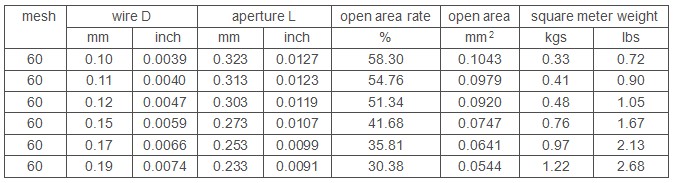 60 mesh plain weave phosphor bronze wire mesh including 60 wires and openings of 1 inch Using 0.10-0.19mm diameter wire, by plain weaving, woven 60 mesh opening for 0.23-0.32mm solid particles , it can also be used as a liquid, gas filter support material or protective fabrics to use. This wire diameter and mesh with ratio reasonable, therefore weave structure is very strong. After 13 whole weaving process, so that the mesh surface flatness better.
