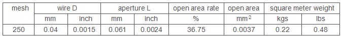 250 mesh twill weave phosphor bronze wire mesh including 250 wires and openings of 1 inch Using 0.04mm diameter wire, by twill weaving, woven 250 mesh opening for 0.06mm liquid or gas filter material. This wire diameter and mesh with ratio reasonable, therefore weave structure is very strong. After 13 whole weaving process, so that the mesh surface flatness better.