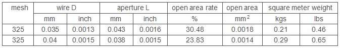 325 mesh twill weave phosphor bronze wire mesh including 325 wires and openings of 1 inch Using 0.035-0.04mm diameter wire, by twill weaving, woven 300 mesh opening for 0.038-0.043mm liquid or gas filter material. This wire diameter and mesh with ratio reasonable, therefore weave structure is very strong. After 13 whole weaving process, so that the mesh surface flatness better.