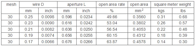 30 mesh plain weave aluminum alloy wire mesh including 30 wires and openings of 1 inch Using 0.17-0.25mm diameter wire, by plain weaving, woven 30 mesh opening for 0.5-0.6mm solid particles , it can also be used as a liquid, gas filter support material or protective fabrics to use. This wire diameter and mesh with ratio reasonable, therefore weave structure is very strong. After 13 whole weaving process, so that the mesh surface flatness better.