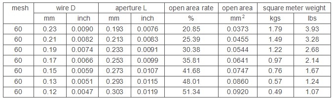 60 mesh plain weave nickel wire mesh including 60 wires and openings of 1 inch Using 0.12-0.23mm diameter wire, by plain weaving, woven 60 mesh opening for 0.1-0.3mm solid particles , it can also be used as a liquid, gas filter support material or protective fabrics to use. This wire diameter and mesh with ratio reasonable, therefore weave structure is very strong. After 13 whole weaving process, so that the mesh surface flatness better.