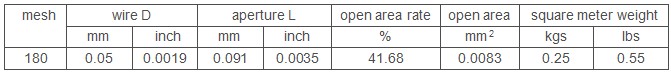 180 mesh plain weave nickel wire mesh including 180 wires and openings of 1 inch Using 0.05mm diameter wire, by plain weaving, woven 180 mesh opening for 0.091mm liquid, gas filter. This wire diameter and mesh with ratio reasonable, therefore weave structure is very strong. After 13 whole weaving process, so that the mesh surface flatness better.