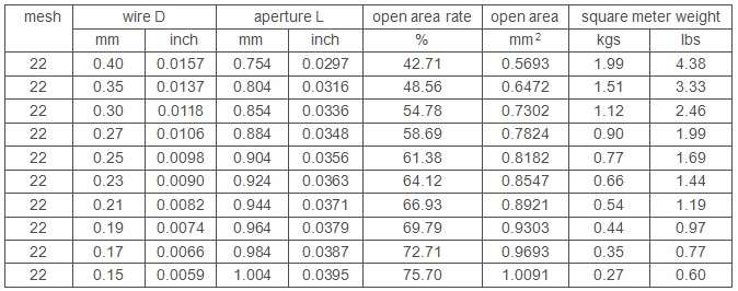 22 mesh plain weave monel wire mesh including 22 wires and openings of 1 inch Using 0.15-0.40mm diameter wire, by plain weaving, woven 22 mesh opening for 0.7-1.0mm solid particles , it can also be used as a liquid, gas coarse filter support material or protective fabrics to use. This wire diameter and mesh with ratio reasonable, therefore weave structure is very strong. After 13 whole weaving process, so that the mesh surface flatness better.