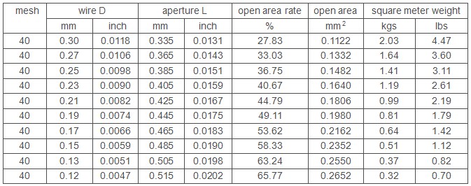 40 mesh plain weave monel wire mesh including 40 wires and openings of 1 inch Using 0.12-0.30mm diameter wire, by plain weaving, woven 40 mesh opening for 0.3-0.5mm solid particles , it can also be used as a liquid, gas filter support material or protective fabrics to use. This wire diameter and mesh with ratio reasonable, therefore weave structure is very strong. After 13 whole weaving process, so that the mesh surface flatness better.