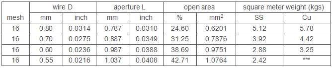 16 mesh plain crimped wire mesh including 16 wires and openings of 1 inch Using 0.55-0.80mm diameter wire, by plain crimped weaving, woven 16 mesh opening for 0.7-1.0mm solid particles. This wire diameter and mesh with ratio reasonable,flat surface, strong wear resistance and firm structure.