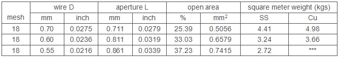 18 mesh plain crimped wire mesh including 18 wires and openings of 1 inch Using 0.55-0.70mm diameter wire, by plain crimped weaving, woven 18 mesh opening for 0.7-0.8mm solid particles. This wire diameter and mesh with ratio reasonable,flat surface, strong wear resistance and firm structure.