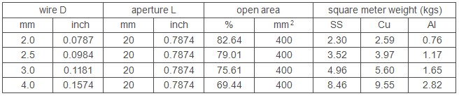 20mm double intermediate crimped wire mesh Using 2.0-4.0mm diameter wire, by double intermediate crimped weaving, woven 20mm opening for solid particles. This wire diameter and mesh with ratio reasonable,flat surface, strong wear resistance and firm structure.