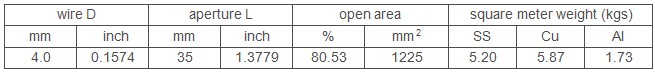 35mm double intermediate crimped wire mesh Using 4.0mm diameter wire, by double intermediate crimped weaving, woven 35mm opening for solid particles. This wire diameter and mesh with ratio reasonable,flat surface, strong wear resistance and firm structure.