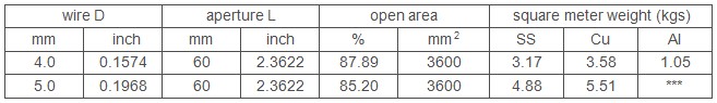 60mm double intermediate crimped wire mesh Using 4.0-5.0mm diameter wire, by double intermediate crimped weaving, woven 60mm opening for solid particles. This wire diameter and mesh with ratio reasonable,flat surface, strong wear resistance and firm structure.