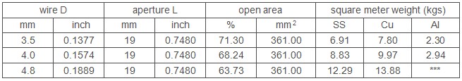 19mm lock crimped wire mesh Using 3.5-4.8mm diameter wire, by lock crimped weaving, woven 19mm opening for solid particles. This wire diameter and mesh with ratio reasonable,flat surface, strong wear resistance and firm structure.