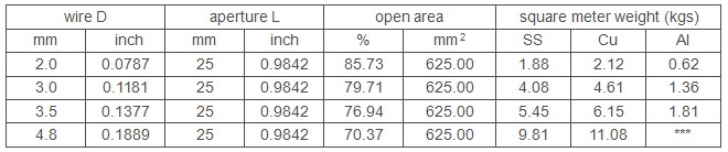 25mm lock crimped wire mesh Using 2.0-4.8mm diameter wire, by lock crimped weaving, woven 25mm opening for solid particles. This wire diameter and mesh with ratio reasonable,flat surface, strong wear resistance and firm structure.