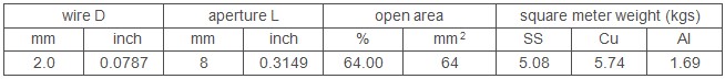 8mm flat top crimped wire mesh Using 2.0mm diameter wire, by flat top crimped weaving, woven 8mm opening for solid particles. This wire diameter and mesh with ratio reasonable,flat surface, strong wear resistance and firm structure