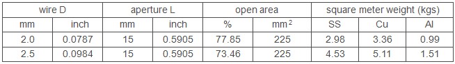 15mm flat top crimped wire mesh Using 2.0-2.5mm diameter wire, by flat top crimped weaving, woven 15mm opening for solid particles. This wire diameter and mesh with ratio reasonable,flat surface, strong wear resistance and firm structure